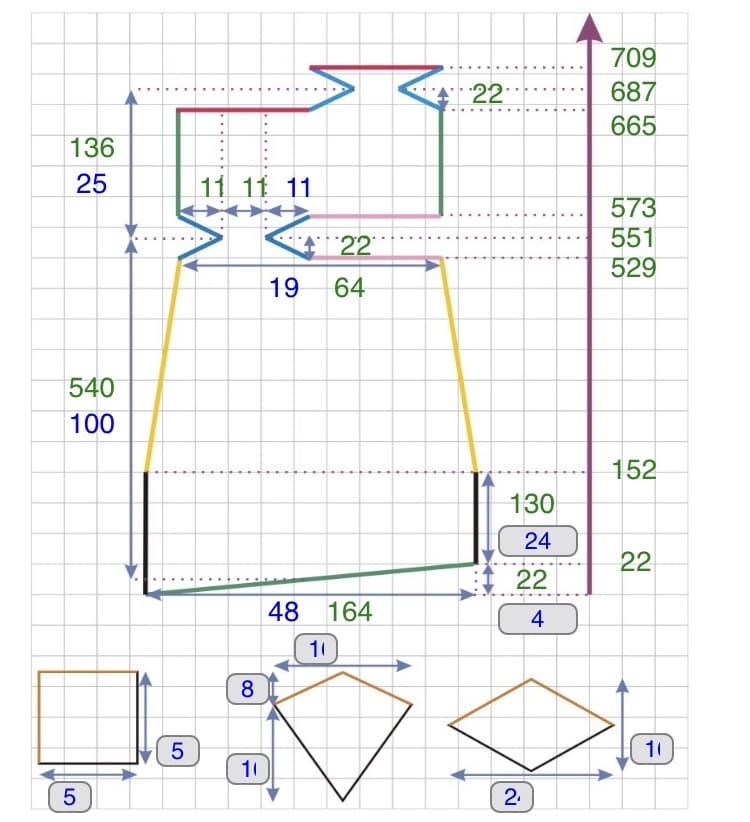 Все числа синим цветом - это размеры в сантиметрах, зеленым - это петли и ряды.