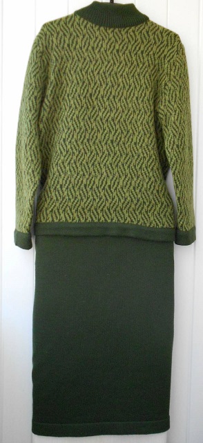 3. Комплект из юбки и джемпера, юбка в 5 сложений пинская цвет т.олива, джемпер однофонтурный жаккард, пряжа пинская т.олива в 3 сложения и итальянская NEW MILL Art. BETA MOULINE в одну нить, размер 48, вес комплекта 850 грамм
