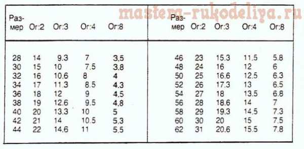 Величина раствора нагрудной вытачки - 4 см (в вязаной одежде эта величина соответствует примерно номеру бюстгальтера). Прежде чем приступить к выполнению чертежа выкройки, познакомьтесь с таблицей. Она поможет вам быстрее сделать расчеты, необходимые для построения.