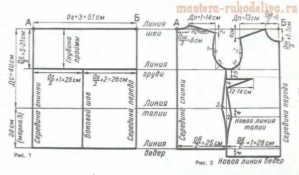 Перед. Для фигуры с широкими бедрами выкройку переда удобнее чертить отдельно от спинки, для нормальной фигуры ее можно сделать на этом же чертеже. Для этого от точки Б вниз по середине переда отмерьте глубину горловины 7 см=(Ош:3)+1 см.