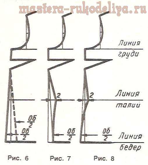 Построение линии бокового шва приталенной модели для фигур с узкими и широкими бедрами показано на рис. 7 и 8.