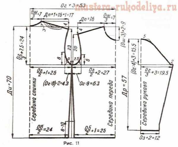 Короткий рукав (рис. 10). Он должен быть более узким. Его самая широкая часть определяется по формуле (Ог:3)+1 см=17 см (или Ор+2 см=17 см) высота оката равна (Ог:4)+2 см=14 см.