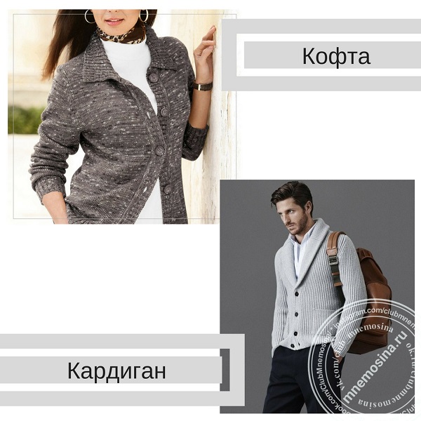 Кардиган - разновидность кофты но с более глубоким вырезом.