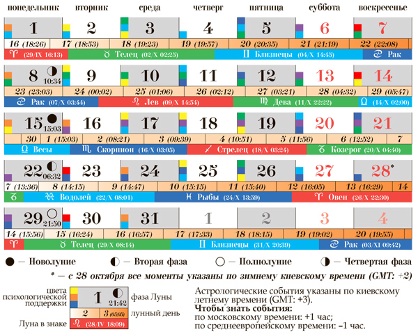 Крупные цифры - день месяца,ниже бежево-оранжевая строчка - это лунные дни и время начала лунного дня ( время на этом календаре московское)Синие, зеленые и красные полоски - это в каком знаке зодиака находится луна в какой день в какое время. А вот что обозначают квадратики цветные где указан день месяца, я пока еще не поняла. Например: 29 сентября,15 лунные сутки начнутся в 18:26,Луна в 17:13 войдет в созвездие овна. Надеюсь понятно. Если нет буду искать другую интерпретацию. Это про квадратики цветные. Лунная радуга Цвета эмоционально-психологической и энергетической поддержки. Черный и белый - нейтральные цвета. – сб – 1 –красный и голубой – вс – 2 –оранжевый и голубой – пн – 3 –желтый и голубой – вт – 4 –зеленый, голубой и желтый – ср – 5 –голубой – чт – 6 –синий, голубой и зеленый – пт – 7 –фиолетовый и голубой – сб – 8 –красный и зеленый – вс – 9 –оранжевый и зеленый – пн – 10 –желтый, зеленый и голубой – вт – 11 –зеленый и желтый – ср – 12 –голубой, зеленый и синий – чт – 13 –синий и зеленый – пт – 14 –фиолетовый и зеленый – сб – 15 –красный и желтый – вс – 16 –оранжевый и фиолетовый – пн – 17 –желтый, фиолетовый и голубой – вт – 18 –зеленый, фиолетовый и желтый – ср – 19 –голубой, фиолетовый и синий – чт – 20 –голубой, фиолетовый и синий – пт – 21 –синий, фиолетовый и зеленый – сб – 22 –фиолетовый – вс – 23 –красный и синий – пн – 24 –оранжевый и синий – вт – 25 –желтый, синий и голубой – ср – 26 –зеленый, синий и желтый – чт – 27 –голубой и синий – пт – 28 –синий – сб – 29 –фиолетовый и синий – вс – 30 –красный и голубой Brother KH868/KR838, интарсия.