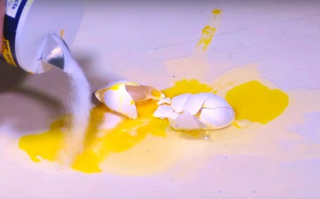 Самый простой способ убрать разбитое яйцо — посыпать густо солью и оставить на 15 минут, затем собрать остатки бумажным полотенцем.