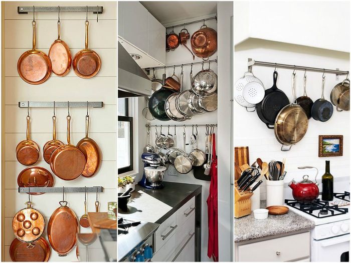 Хранение кастрюль на стене значительно экономит место в небольшой кухне. Конечно, для такого варианта стоит выбирать место около плиты, мойки или возле стола, чтобы кастрюли, висящие на стене, не мешали спокойно передвигаться по кухне. Наиболее удобно хранить кастрюли и сковородки недалеко от варочной панели. Это экономит не только место в комнате, но и время хозяйки, сокращая время приготовления блюд.