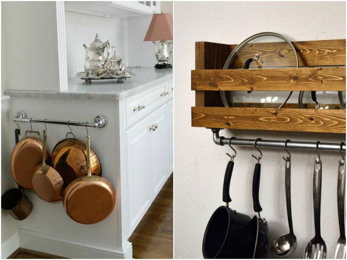 Удобно хранить кастрюли на рейлингах с крючками. Их можно установить куда угодно – на стену, над окном и даже закрепить на мебели. Но если нет возможности приобрести подобное приспособление, то его не сложно сделать его своими руками из подручных материалов.