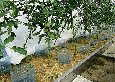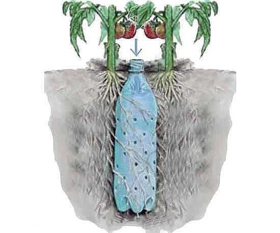 Этот способ полива очень бюджетный и прост в исполнении. Закопайте на грядках через 1 метр пластиковые бутылки с мелкими отверстиями в нижней части. Объем бутылок зависит от размера поливаемого участка ( от 1,5 литров и более). Теперь, при необходимости полива достаточно наполнить бутылки водой. Скорость полива будет зависеть от размера отверстий в бутылках. Желательно, чтобы вода поступала в почву медленно, не размывая грунт. Для большей пользы разведите в воде компостный чай.