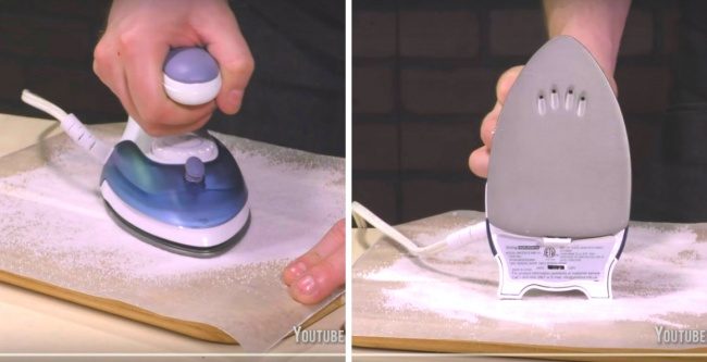 Возьмите деревянную разделочную доску, положите на нее пергаментную бумагу и щедро посыпьте солью. Включите утюг, дайте ему прогреться, затем энергичными движениями поводите утюгом по соли в течение минуты.