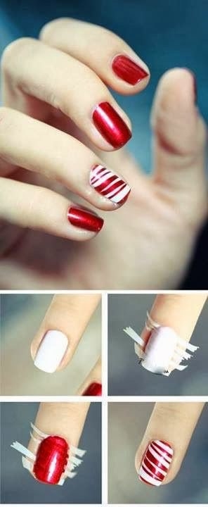 Наклейте клейкие полосочки на ноготь, оставив небольшие расстояния между ними. Закрасьте эти промежутки лаком нужного цвета. Дождитесь, когда лак высохнет и снимите полоски.