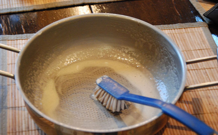 Подходит для чистки посуды из нержавейки и алюминия, а вот для эмалированной посуды не рекомендуется. Уксус –отличное домашнее средство для избавления от гари. Перед тем как отчистить кастрюлю, нужно залить ее 9%уксусом и выдержать 2-3 часа. Затем следует стандартная процедура мытья. Также можно прокипятить воду в кастрюле с добавлением ½ стакана уксуса и половинкой бруска хозяйственного мыла 72% 30-60 мин в зависимости от степени загрязнения.