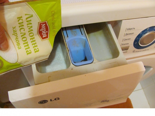 Очистить машину от накипи и водяного камня поможет обычная лимонная кислота. В отсек для порошка засыпаем 60 грамм лимонной кислоты. Запускаем машинку на полный цикл стирки с максимально высокой температурой.