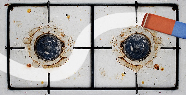Убираем жир с поверхности плиты и с мелких деталей обычным ластиком. Этим способом пользуются сотрудники профессиональных клининговых служб