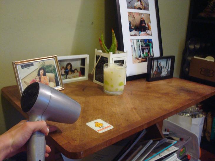 Иногда случается, что наклейка совсем не хочет отклеиваться. Не беда - возьмите фен и немного прогрейте стикер, после чего он с легкостью отойдет.