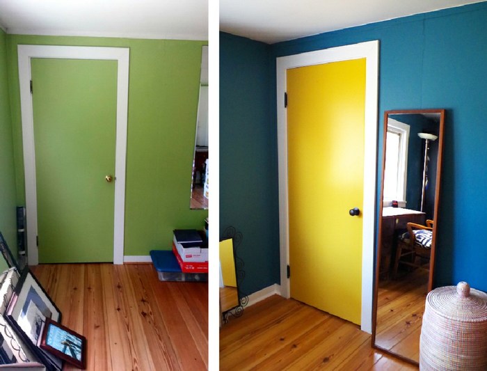 Самый популярный и простой способ декорирования двери — покраска. Легче всего красить те двери, которые изначально продавались как «под покраску» или были окрашены ранее. Выровняйте поверхность (шкуркой и шпатлевкой), подготовьте ее под покраску и начинайте творить! И вот несколько идей, как покрасить дверь интересно: