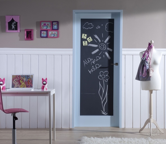 Покрасьте дверь специальной краской, чтобы на ней можно было писать мелом как на школьной доске. Тогда ее внешний вид можно будет менять: то воодушевляющая цитата, то нарисованные молдинги, то озорная карикатура на членов семьи. Особенно такой двери будут рады дети — на ней можно рисовать, записывать очки в играх, играть в школу, учить азбуку или оставлять на краске стихи для запоминания.