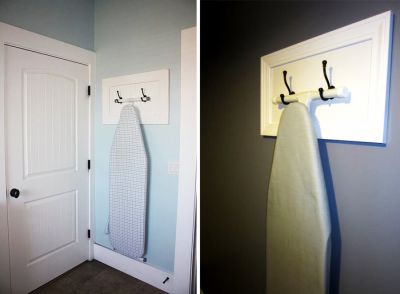 Честно вам признаюсь, у нас в доме гладильная доска хранится как раз за вечно открытой дверью в спальне. Ее можно просто прислонить к стене, а можно красиво подвесить как на примере ниже. Не забывайте периодически менять чехол на доске, чтобы он был чистым и аккуратным.