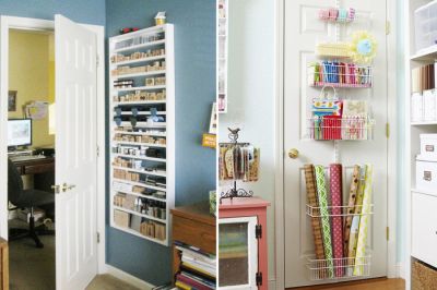 Принцип с узким шкафом и подвесными полочками за дверью работает и в отношении таких мелочей, как фурнитура для творчества, оберточная бумага и домашняя аптечка (главное хранить тут только то, что может находиться в тепле, к тому же, если в доме дети, то лучше все-таки убрать лекарства с глаз долой). Те, у кого есть хобби, знают, как сложно разместить все необходимое для шитья, вязания, лепки и других увлечений дома. Но если душа требует, надо искать варианты, и пространство за дверью — один из них.