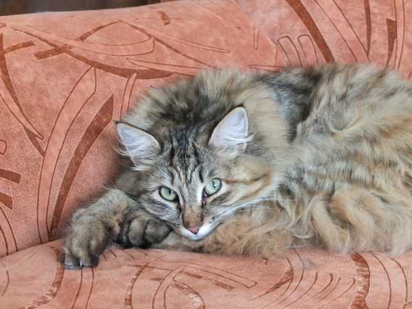 Средняя кошка у нас самая скромная и самая упитанная. Фотографироваться не любит. У нее любимое занятие наблюдать как нитка с бобины на моталку соскальзывает. как завороженная сидит и смотрит :) Фото только в компании с младшей нашла