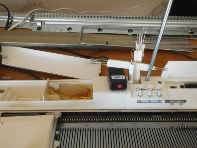 В комплекте накладные рельсы, адаптер для сети, ограничители, родные перфокарты. Есть сенсор, который срабатывает при обрыве нити. Нитенатяжитель с двумя длинными направляющими усиками. Имеет счетчик встроенный Закрывает последний ряд изделия Может перерабатывать более толстую пряжу, чем машина 5 класса. Прилагается инструкция и подборка с инета по вязанию на роботе.