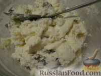 В миску выложить творог, добавить сахар. Хорошо перетереть. Затем добавить изюм. По желанию ваниль. Хорошо перемешать