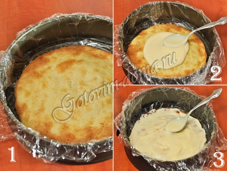 Разъемную форму для выпекания (большего диаметра, чем испеченные коржи) слегка смазать растительным маслом и застелить пищевой пленкой.