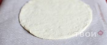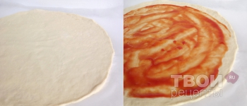 Тесто скатать в шар, положить на стол, слегка посыпанный мукой. Раскатать в тонкий круг. Смазать томатной пастой.
