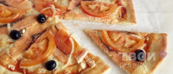Между рыбой положить тонкие ломтики помидора, маслины. Пиццу сбрызнуть оливковым маслом и отправить запекать минут 10-12 при 250С. Затем горячую пиццу посыпать орегано.