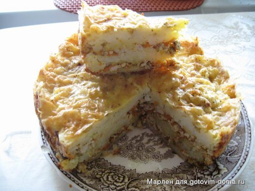 Сверху посыпать сыром, натертым на крупной терке. На сыр уложить рыбу, порезанную полосками, тонко нашинкованный репчатый лук.