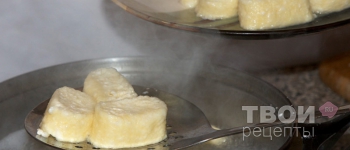 Затем опускаем в кипящую, подсоленную воду и варим до готовности (примерно 2-3 минуты). Готовые вареники достаем с помощью шумовки на тарелку, к ним добавляем сливочное масло и теплыми подаем к столу, (по желанию со сметаной, медом, вареньем). Приятного аппетита!