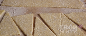 Охлажденное тесто раскатать в прямоугольник, затем разрезать на треугольники. Посыпать сахаром