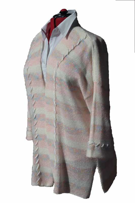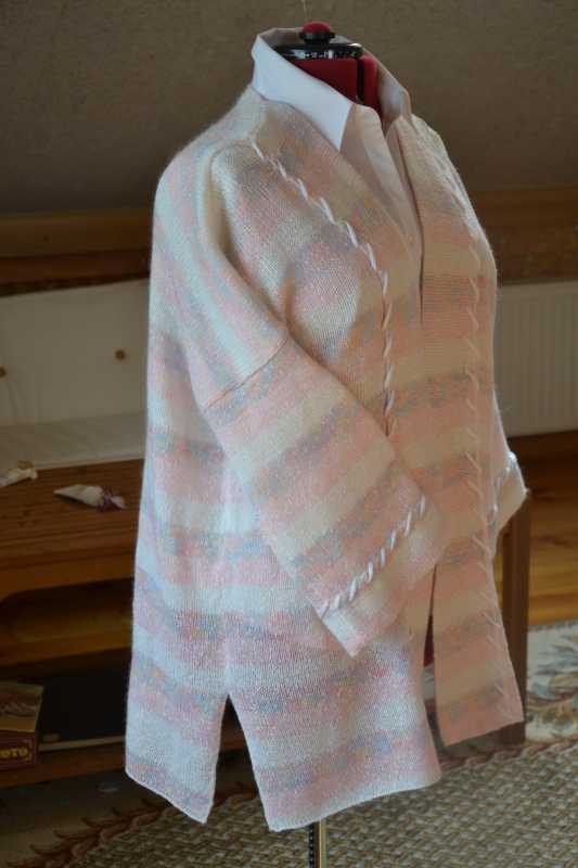 О пряже: 3 разные по составу пряжи - 1- итальянская KID MOCHER трёх цветов белый меланж и розовый + белая ниточка вискозы + какая-то белая тоненькая ниточка (как бы с узелками. Через каждые 5 см (я просто не помню состав, потому что покупала её очень давно,) эти две белые ниточки добавленые в каждый цвет. Она как бы нивелируют полоски, они становятся не такими резкими, как бы размытыми. Могу посоветовать соединять мохер и вискозу в одну нить тогда изделие приобретает удивительную приятность наощупь