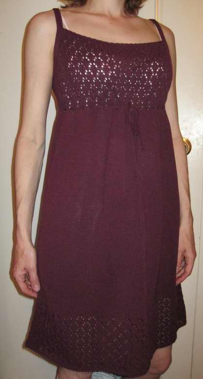 Описание по петлям давать не буду, т.к у всех петельная проба своя. Делаем расчет по схеме кокетки. Юбку вяжем двумя прямыми полотнами, набрав кол-во петель в 1,5 раза больше, чем необходимо для кокетки. Отвязав юбку на желаемую длину, срезаем ее на бросовую нить, равномерно припосаживаем(до кол-ва петель для кокетки), сразу выполняем дырочки для шнура и вяжем кокетку. После ВТО обвязываем верхний край кокетки 1-м р. ст. бн и 1-м р. "рачьего шага". При сборке кокетку полочки припосаживаем, но с таким расчетом, чтобы кокетка спинки по боковому шву оказалась длиннее на 1 см.(на схеме пунктирная линия). Бретели вяжем ластиком шириной 1 см и немного длиннее необходимой длины, срезаем на бросовую нить.После ВТО пришиваем бретель к спинке(к выступающему 1 см по боковому шву) , по пройме, и , точно отмерив необходимую длину(распускаем БН и закрываем петли), к верхнему краю спинки.