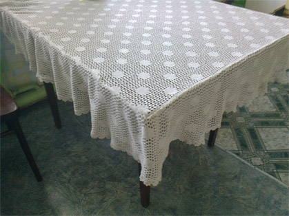 скатерть 80*110, у меня стол длиннее, поэтому в конце собирается. Набирала на 200 игл, провязала 505 рядов. Для оборки 52 петли на 1968 рядов (кол-во рядов смотрела по рисунку). Все это, если вязать на 4 плотности. Оборку со столешницей соединяла крючком.