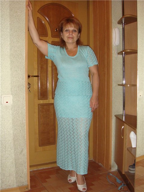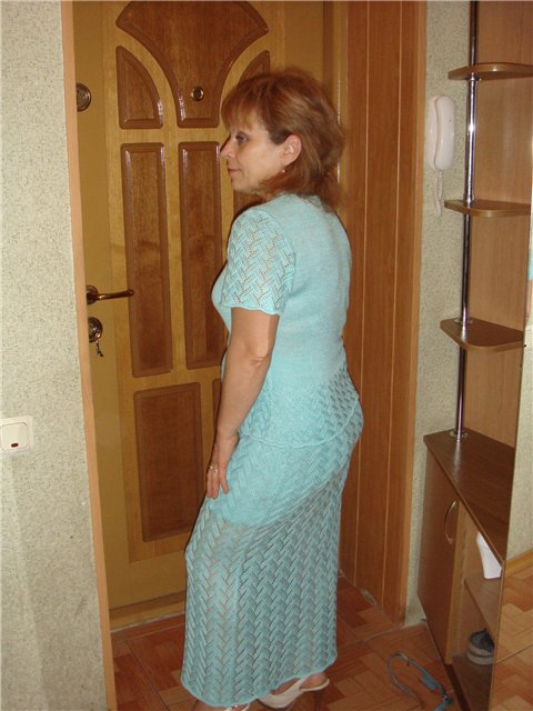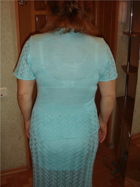 Девочки, это один из моих долговязов. Виринея, в сестры по ажуру берешь? Блузон -Вискоза/акрил в 2 сложения, плотность 1** и ажура и кулирка, в режиме платинг. Юбка в 2 сложения на плотности 3.
