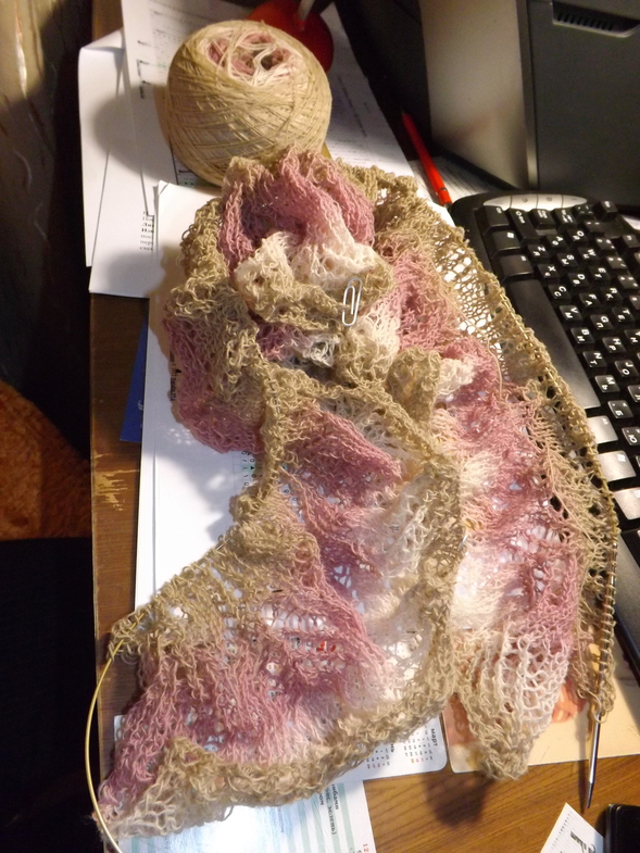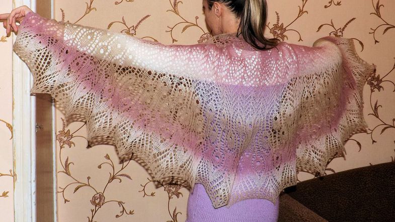 Небольшая шалька "Птица Гамаюн"(от Наташи LedyN ) из кауни, спицы 3,5. Вязала в подарок.