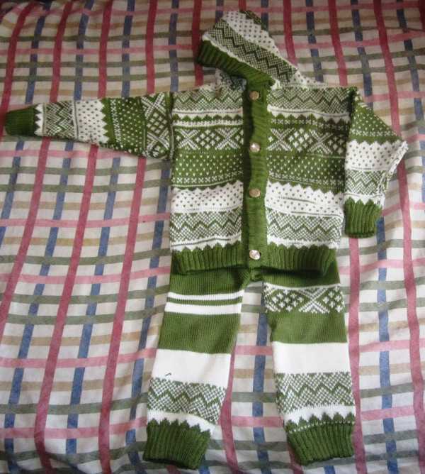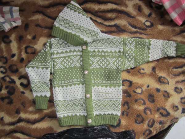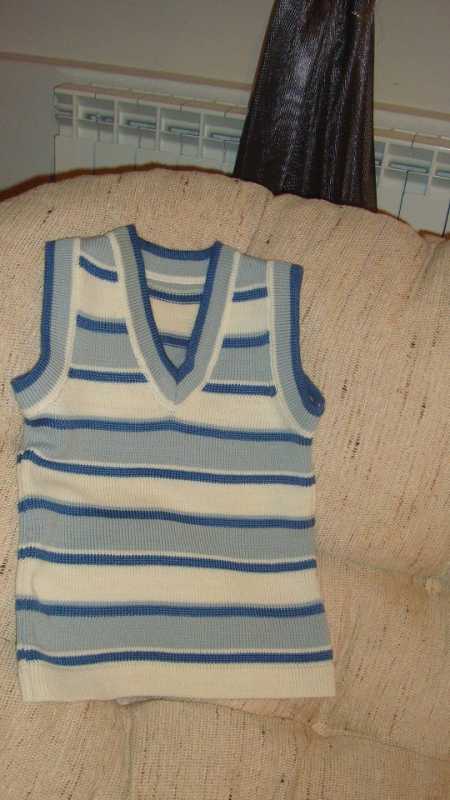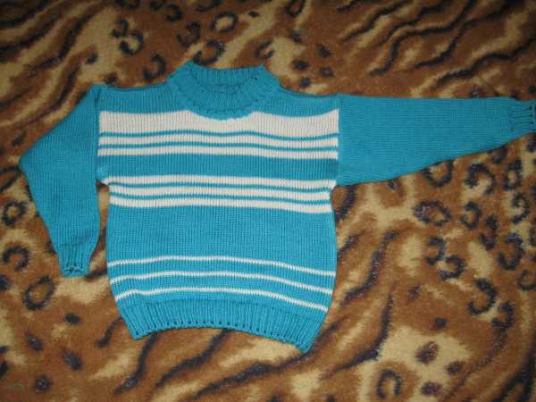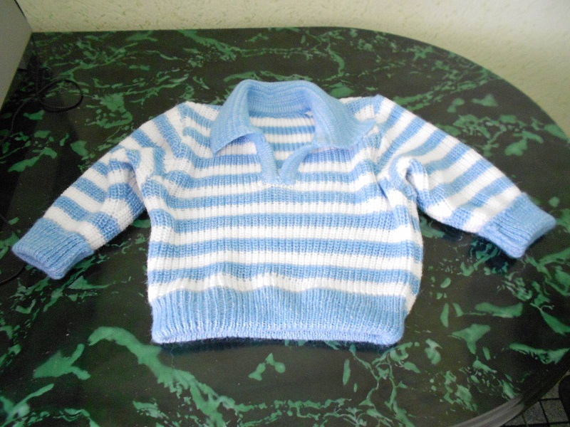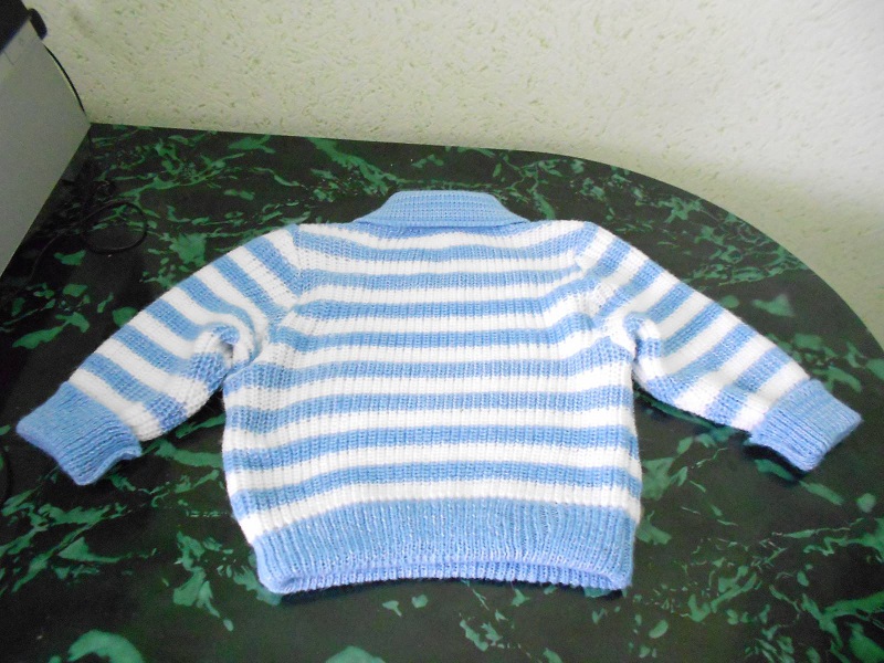 И детский свитер в полоску на ребенка до 1 года также в две нити:голубая и белая альпака и 1 нить фризе для матового блеска в белых полосках и эффекта "инея" в голубых. Свитер также связан полуфангом, резинки 1Х1, воротник - переплетением "велле" с кеттлевкой в "карман".