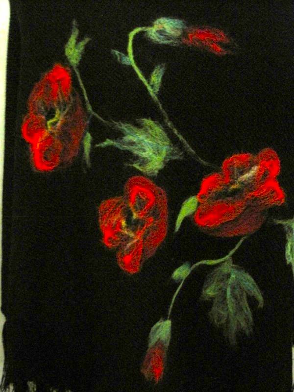 Ириш,спасибо!!! А рассказывать особо нечего, маки сделала при помощи иглопробивной машинки. Сначала нарисовала мелом на вязаном полотне, потом шерсть прядками накладывала и машинкой приваливала. Рисовать я не больно мастерица, ну уж как получилось. На другом форуме мои маки назвали розами)))