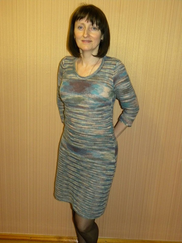 Девочки, спасибо за добрые слова. Село платье хорошо благодаря здешней программе, на груди выточку теперь обязательно делаю. А пятна сами получились. На пряжу долго глядела, потом таки заказала, а потом весь инет облазила, как из секционки вязать, чтобы нормально получилось, долго мучилась, а потом взала и просто связала, как легло так и легло. Только горловину не вывязывала, а подрезала, чтобы симметрия все же осталась.