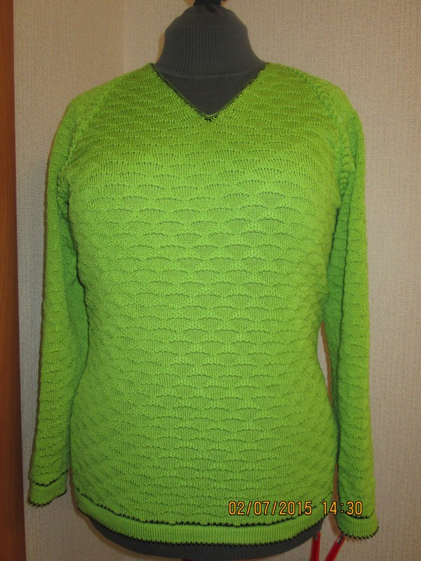 Кофточка р.42, платинг пл.8 , 2 нити лен/акрил + 1нить х/б, внизу ручная деккеровка а-ля Миссони на пл.6, 2 нити лен и 1 нить акрил, рукава и горловина обвязаны петельками (очень нравятся мне они)
