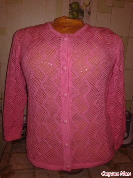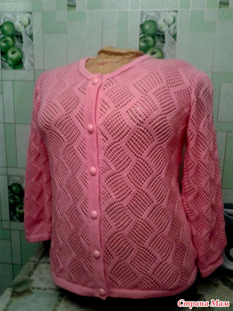 У меня тоже новая кофточка. На 52-54 размер ушло 4 мотка Картопу Супер Перле, 400 метров в 100 граммах. Связано на машине Бразер КН-821 на плотности 7.