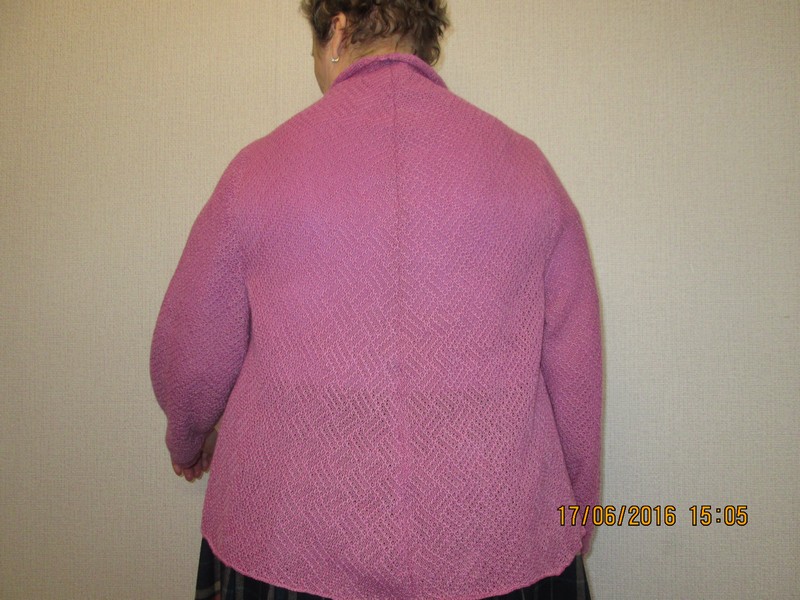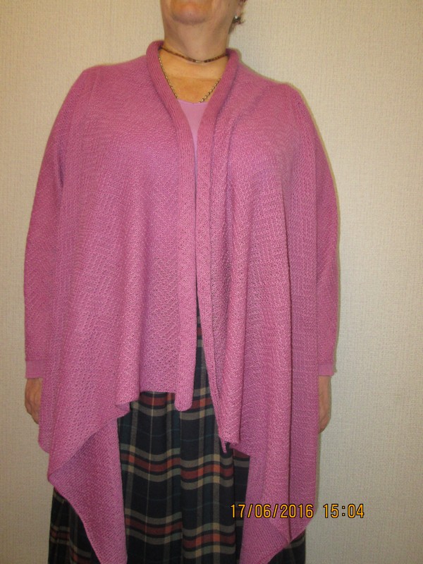 Моя троюродная сестра - умница и просто красавица - собралась на отдых в горы, а там вечера и ночи прохладные, так что с пылу-жару - за 2 дня кардиган к её отъезду готов. Размер одежды у сестры немаленький, 60 российский - 120 см объем груди и такой же объем бедер, но мы сделали это! Как известно, не бывает полных женщин, бывают неумелые вязальщицы :haha: :
