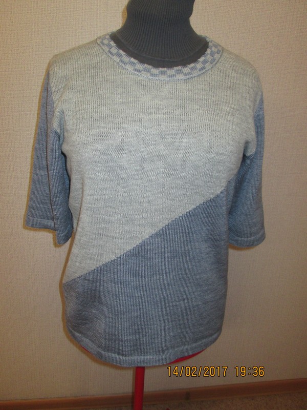 Основное полотно - кулирная гладь, низ пуловера, манжеты рукавов и воротник шалька - платинг на резинке 2х2.