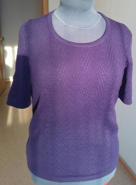 Основное полотно - кулирная гладь в 3 нити плотность 3, края подола, рукавов и бейка горловины - сдвоенная кулирная гладь (круговое вязание). Отделка - фасонные убавки и прибавки петель деккером, ажурная деккеровка по бейке горловины.