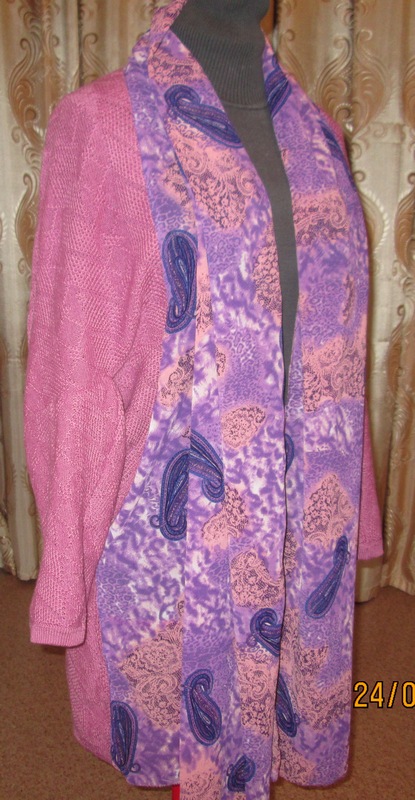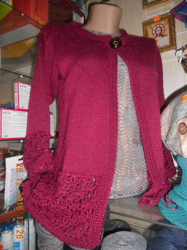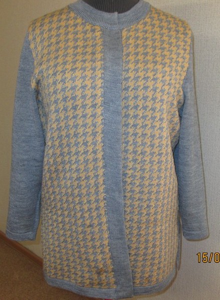 ПШ в 3 нити, ОФЖ-Гусиные лапки, ПК № 13, плотность 4, спинка и рукава однотонные, планка связана по вертикали с центральной иглой в ЗНП, внутри клеевая прокладка. Пуговиц пока нет, петли пробью на швейной машине.