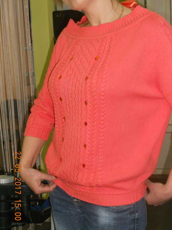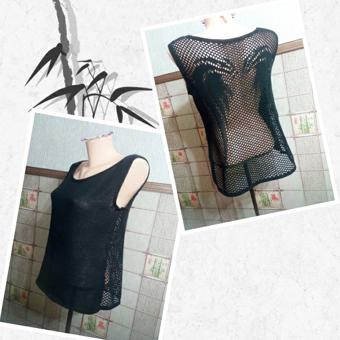 Суперджилонг 1 нить + ПШ 1 нить, на плотности 5, разрез на горловине - по изнанке вивинг в 3 нити ПШ, другой обработки нет, разреза по бокам обвязаны крючком.