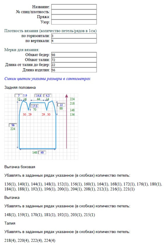 Обновила программу. Пересчитала скос по талии. Добавила номера петель в местах вытачек. Петли отсчитываются от начала вязания с левой стороны.