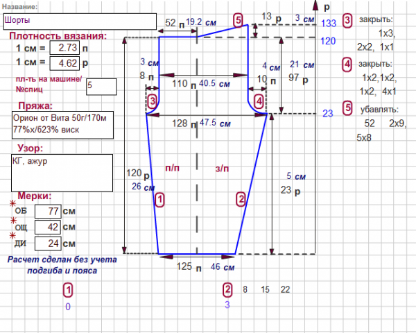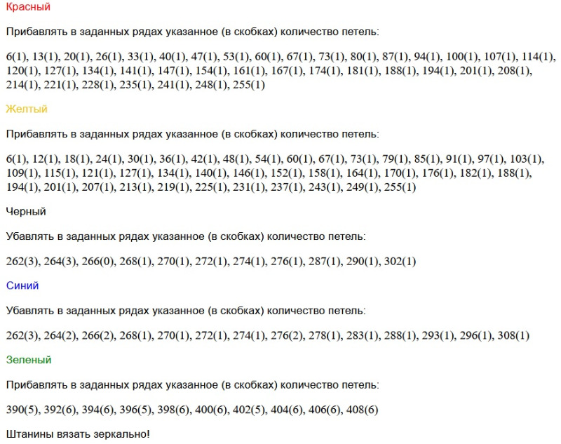 Подскажите, пожалуйста. Детские штанишки, если хочу сделать их прямыми:сделала ширину внизу равную ширине по бедрам (цифра между 3 и 4). Программа выдает по п.1 -2, по п.2 2 в 68 р. Что это значит? В п.1 убавить 2 петли в каком ряду? 68? А в п.2 прибавить 2 петли в 68? Может как-то по-другому надо делать прямые брючки?