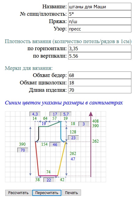 пока писала, появилась картинка. Ничего не видно. Я так поняла, что ширина низа и по бедрам штанины выставлена одинаковая, а предлагается прибавить петли? Не обращайте внимания. Вяжите ровно. В программе заложено, что прибавки по задней части штанины больше, возможно из-за этого вылез минус. Дальше выше по расчету это нигде не используется, ошибки быть не должно.
