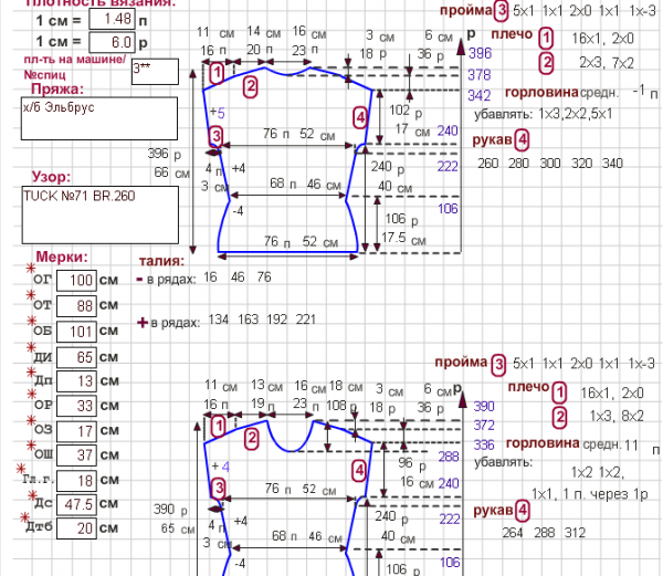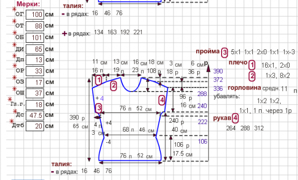 Девочки, добрый вечер. Помогите, разобраться :worthy: . Построила выкройку, возник вопрос. По груди 106п, прибавки по пройме 6п с каждой стороны(смущает последняя прибавка 1х0) т.е. всего 12п, следовательно 106+12=118. Теперь суммирую петли на выкройке:22+22+24+24+32=124п
